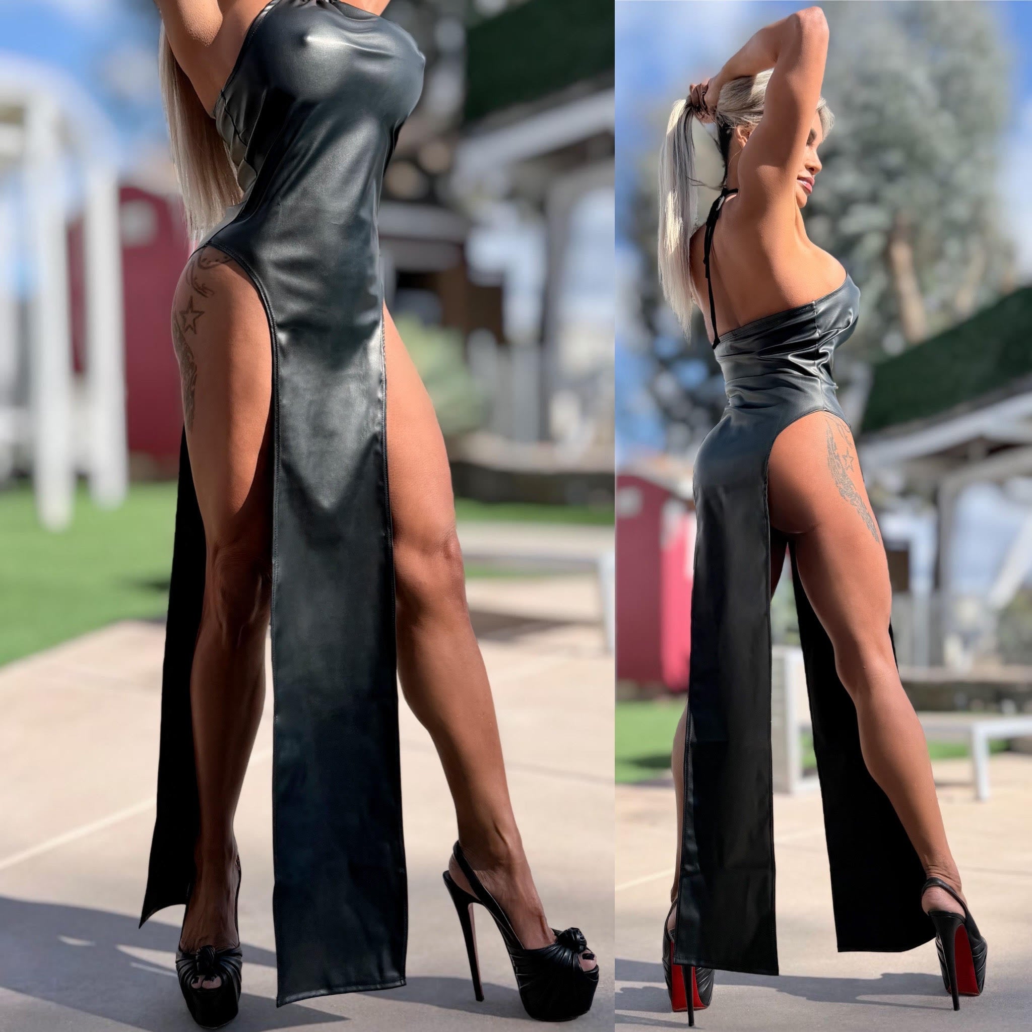 This is a Super Soft Stretch Faux Leather Dress with an adjustable tie closure...