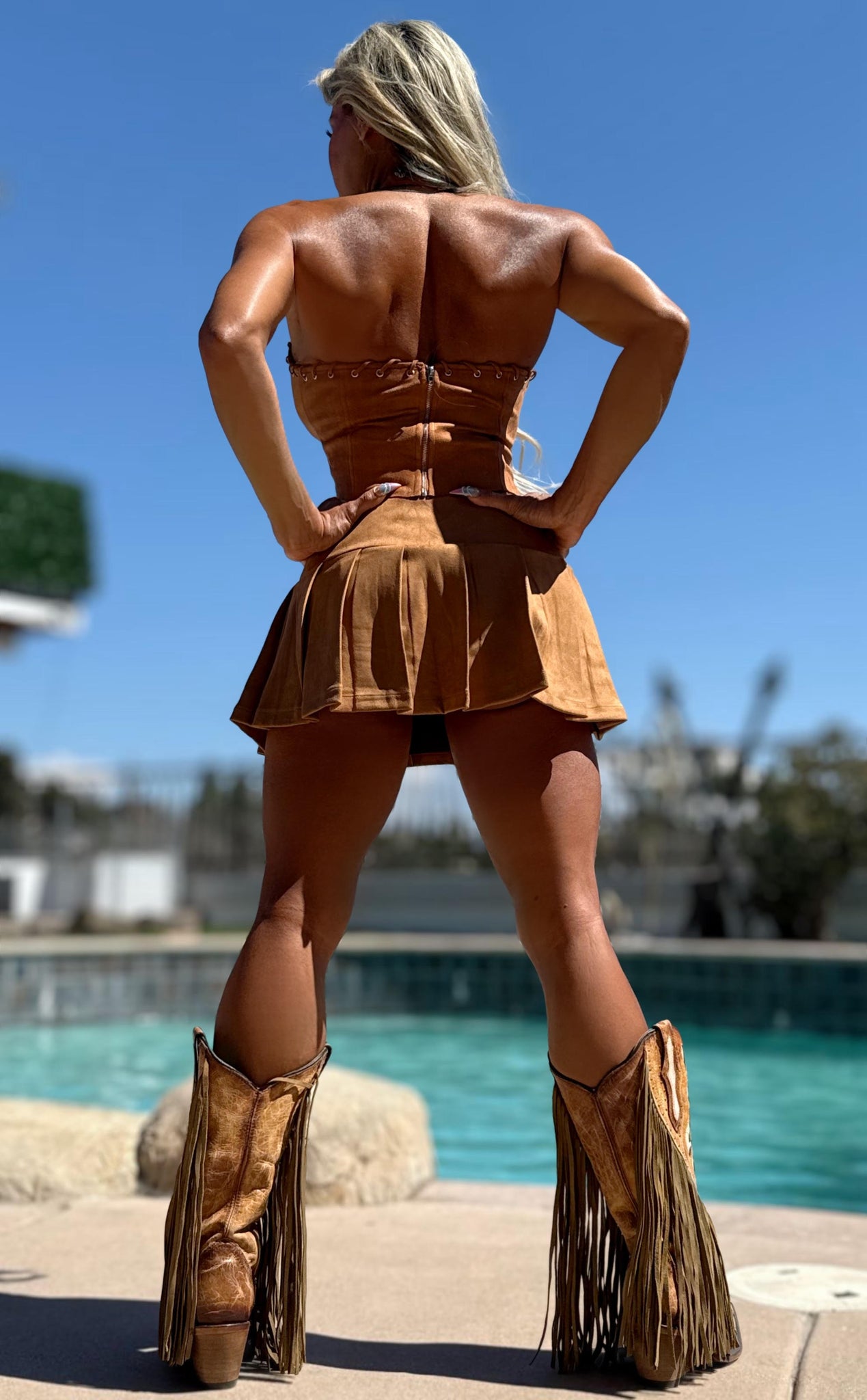 Connie's SKIRT ONLY "RICH URBAN COWGIRL 🤠 TAN X SUEDE PLEATED SKIRT" STUNNING Stretch Pleated Skirt with Built in Booty Shorts
