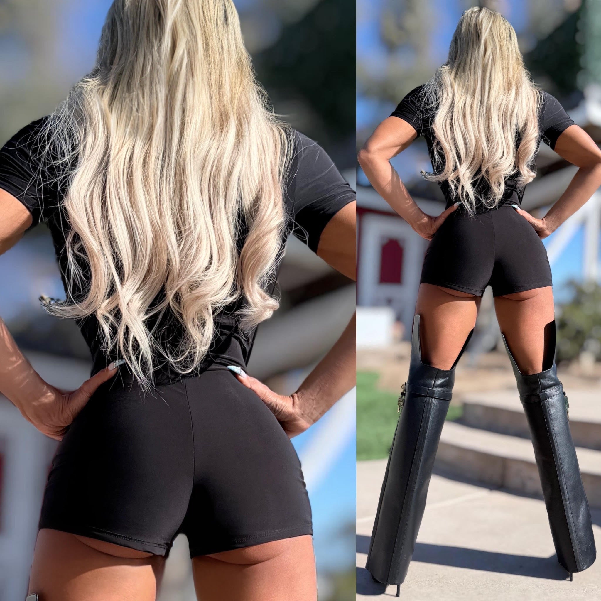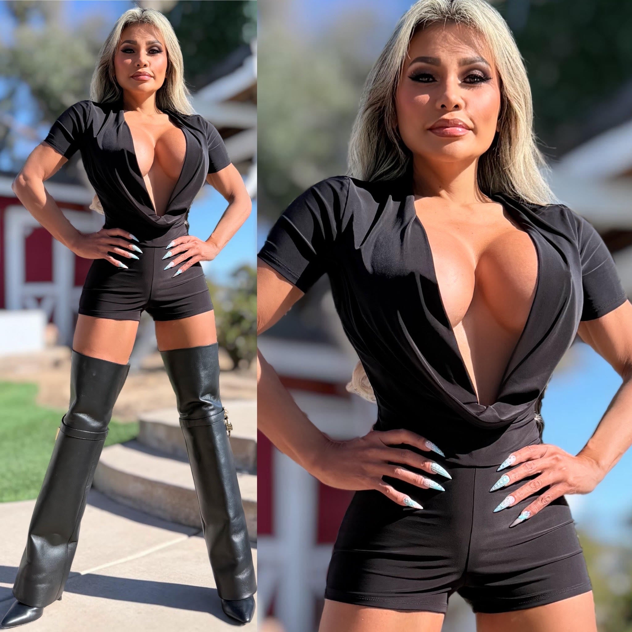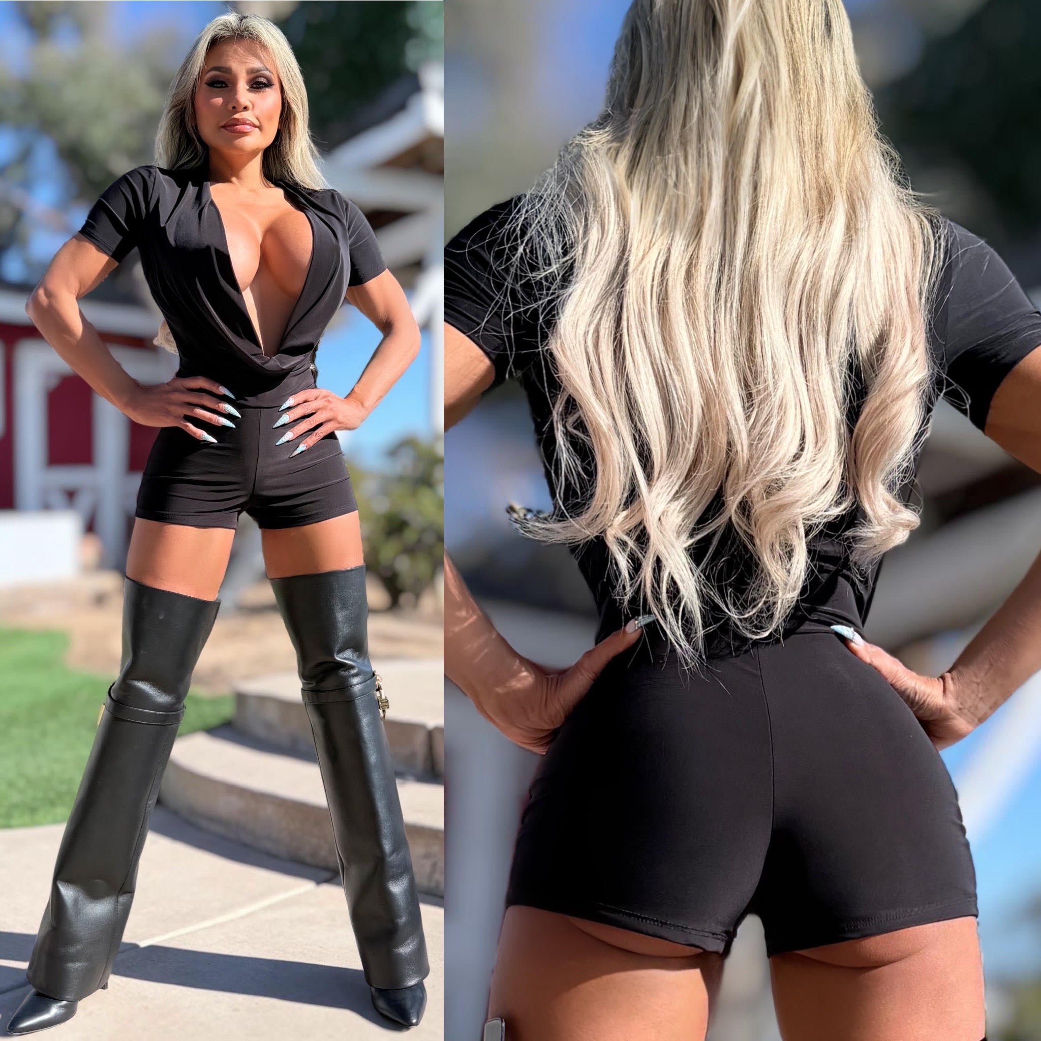Connie's LIMITED "BLACK CLUB ROMPER 🍸" DEEP COWL PLUNGE with BOOTY PEEP, FULL stretch Fit No Zippers