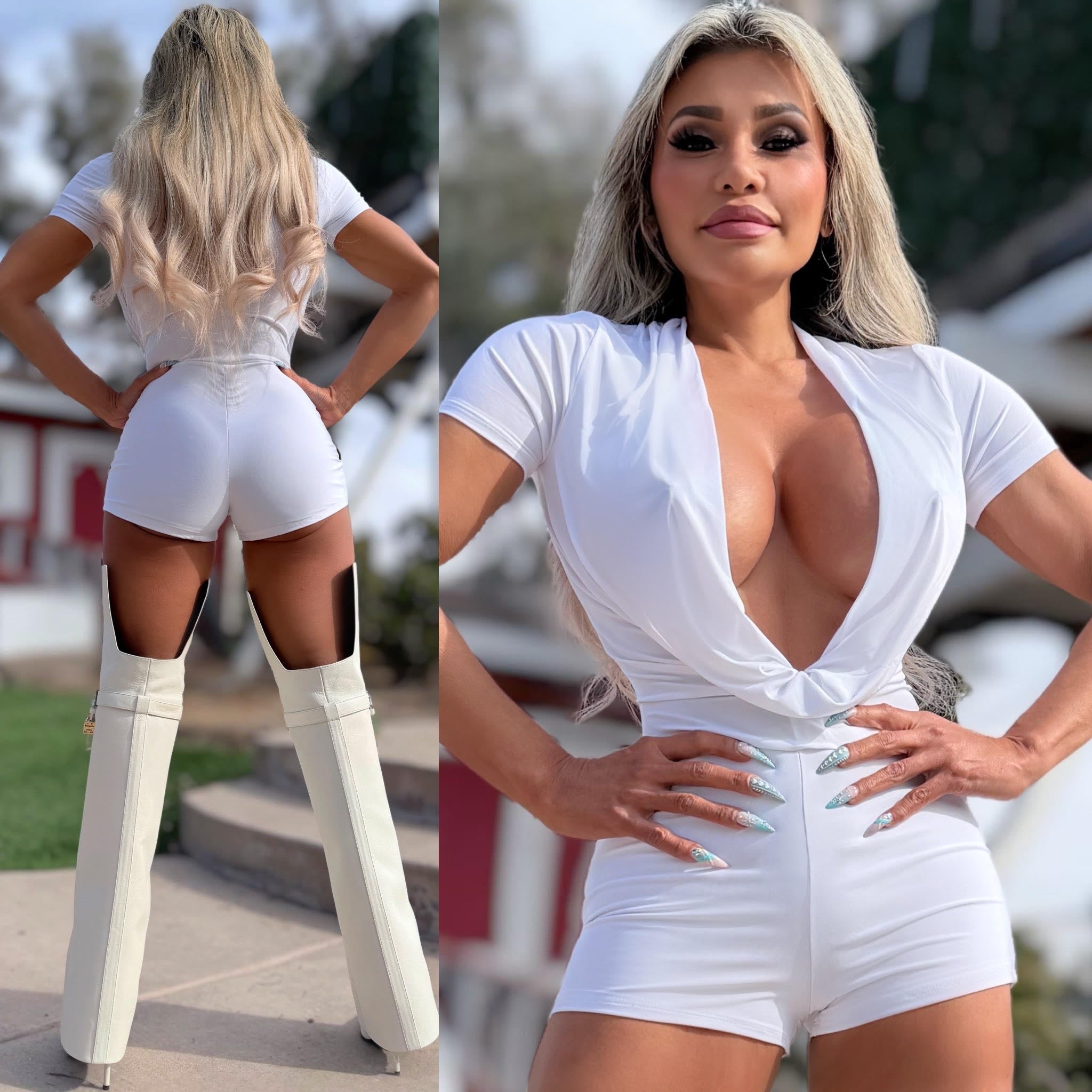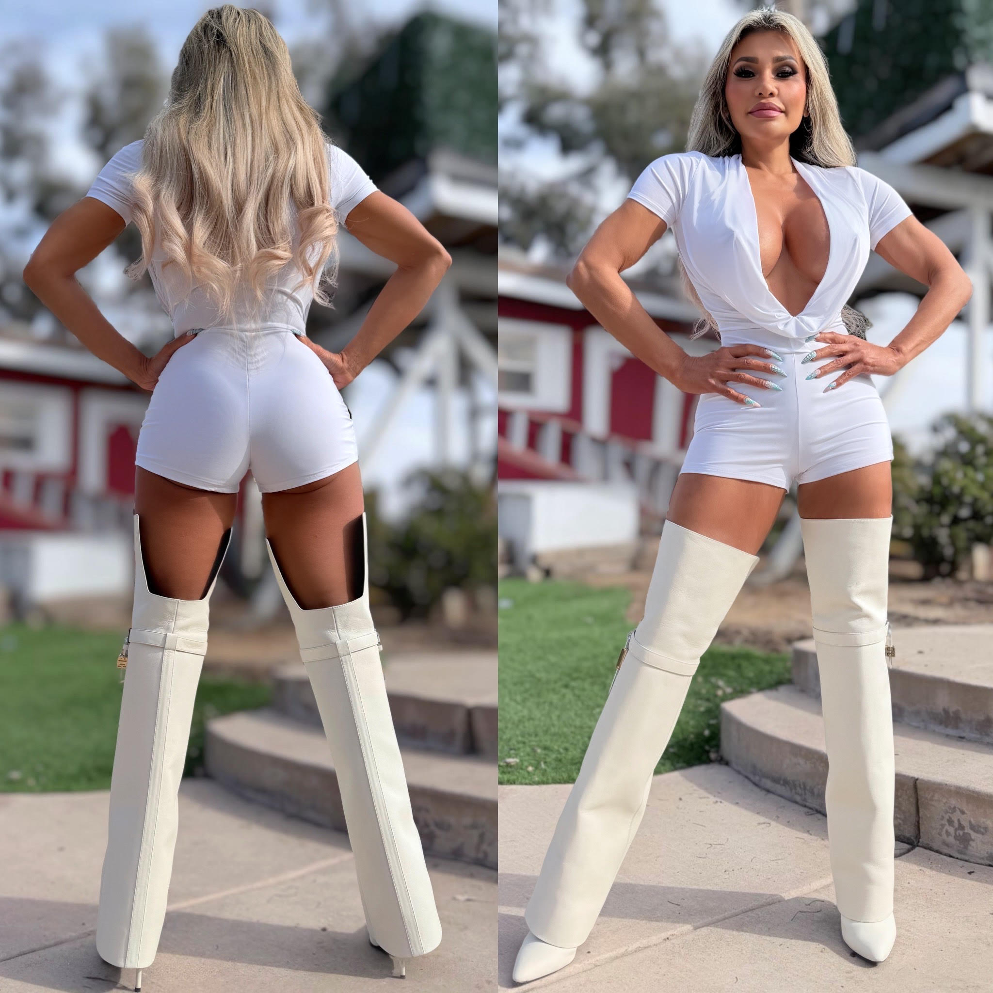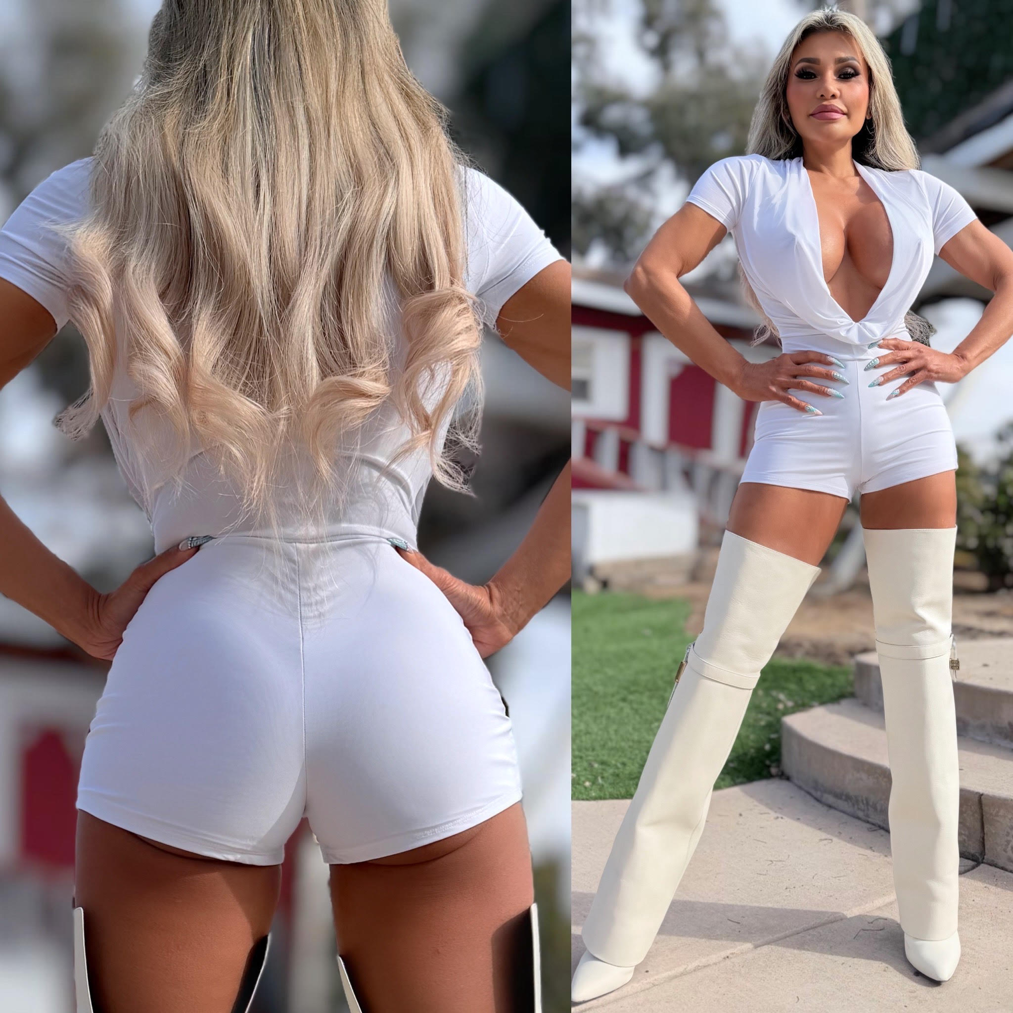 Connie's LIMITED "WHITE CLUB ROMPER 🍸" DEEP COWL PLUNGE with BOOTY PEEP, FULL stretch Fit No Zippers